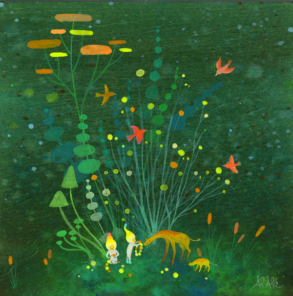 A: Our collaboration is unique. Aaron creates a surreal background and Ayumi comes in with her playful creatures to explore. We use our strengths to create an original work of art that we couldn’t create as individual artists. There is magic in collaboration.